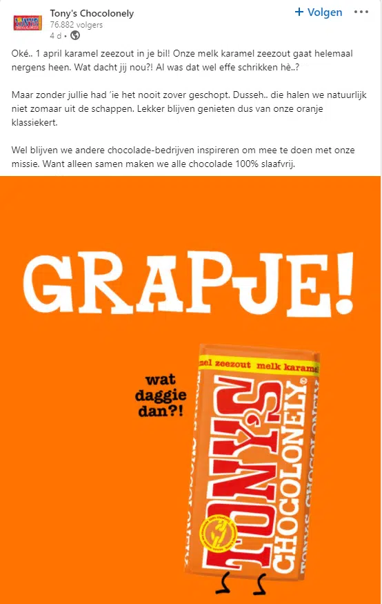 Tony Chocolony maakte de 1 april grap dat de ó zo geliefde karamel zeezout reep uit de schappen gehaald zou worden. Bij de onthulling van de grap gebruikten zij een informele, lollige, tone of voice. Ze kregen hier veel leuke reacties op. Ook op LinkedIn was de 1 april grap van Tony Chocolony op z’n plaats omdat het perfect aansloot op hun merkidentiteit.