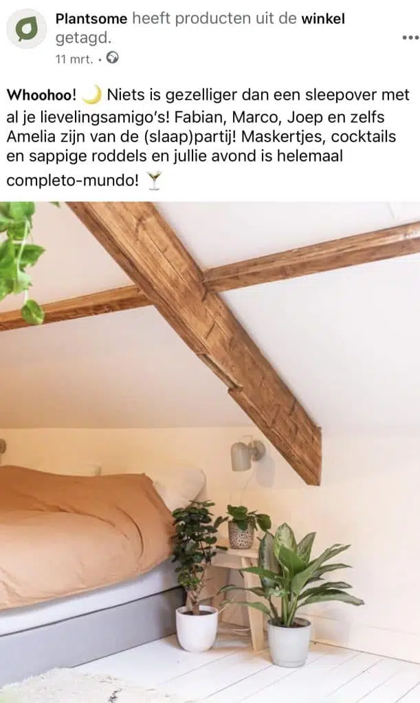 Een leuk voorbeeld van een bedrijf met een duidelijke merkidentiteit, is Plantsome. Zij bieden een combinatie tussen een webwinkel en een app die de aankoop en verzorging van planten zo plezierig en toegankelijk mogelijk maakt. Binnen het Brand Personality Spectrum zitten ze erg links. Dat vertaalt zich in een informele en persoonlijke tone of voice op zowel website, social media als verpakkingen. Zo hebben al hun planten hedendaagse namen zoals Marco en Amelia, waardoor speelse copy’s zoals hieronder mogelijk zijn.
