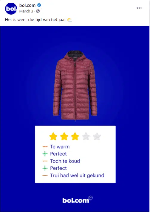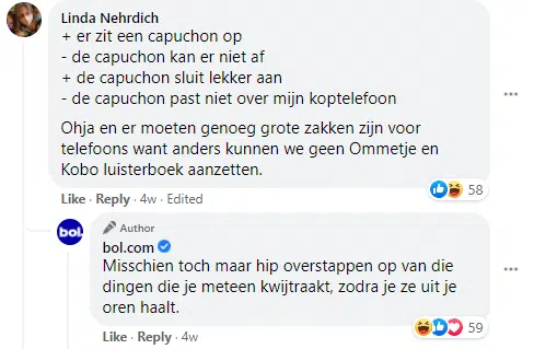 In het voorbeeld hieronder gebruikt bol.com reviews die door klanten zijn achtergelaten op een humoristische manier voor content op hun Facebookpagina. En ook in de reacties daarop zien de webcare medewerkers ruimte voor een grapje.
