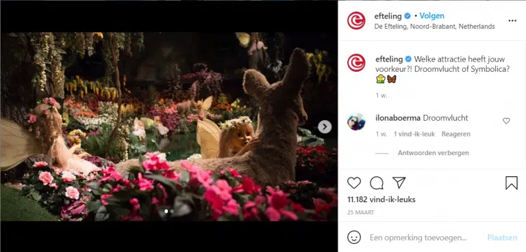 De Efteling zoekt met een sprookjesachtige afbeelding van het pretpark en een vraagstelling in de omschrijving de interactie met hun volgers op.