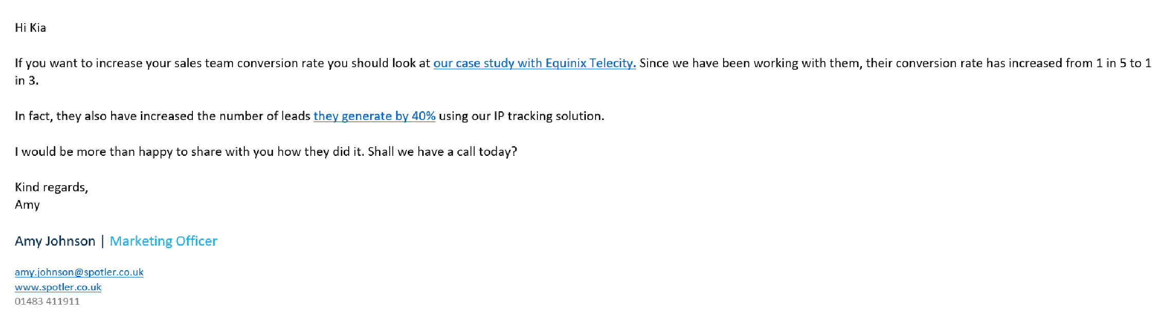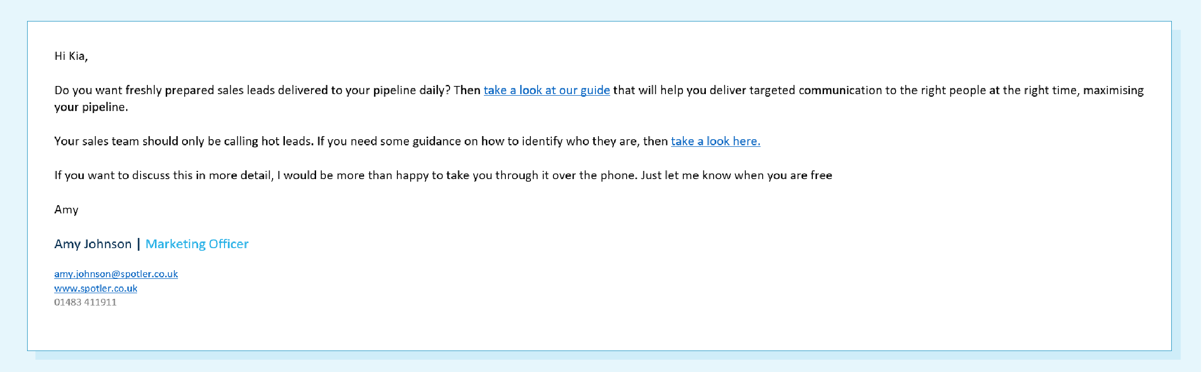 The ‘more information’ email campaign is among our most effective and successful. We’ve seen a CTR of 8.46%, where people have used the links provided to further research Spotler. The email offers an overview of the platform rather than drilling down into any specifics, giving the lead all the information they may need to intrigue them into organising a demo.
