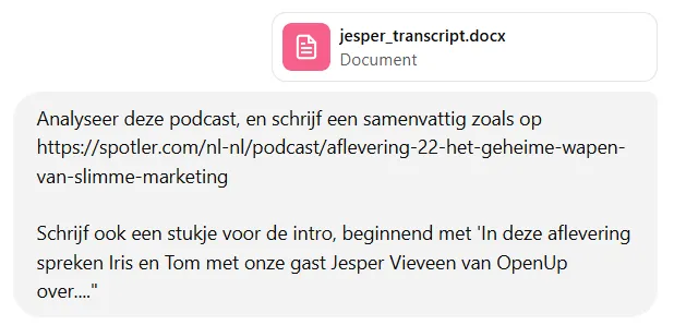 Zeker als marketeer werk je vaak met een bepaalde tone-of-voice. Voorbeelden daarvan zijn ongetwijfeld op je website te vinden. Deze informatie (de URL) kun je altijd in je prompt meegeven ter inspiratie. En help ChatGPT door te zeggen hoeveel woorden je wenst.