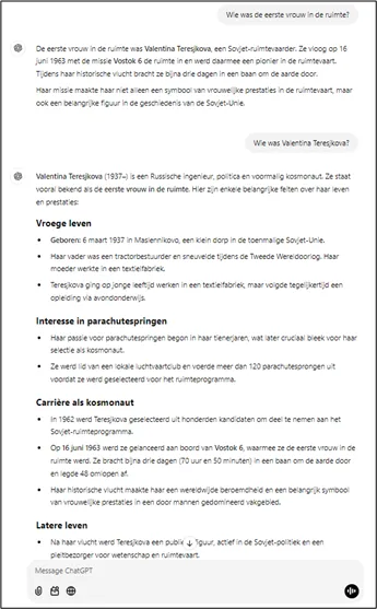 ChatGPT behandelt beide vragen anders. Onthoud: wil je goede prompts maken dan moet je zo specifiek mogelijk zijn of ChatGPT op weg helpen met vervolgvragen.