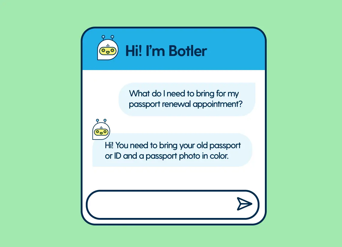 Use chatbots to handle routine public queries automatically, 24/7, by standardising common questions or requests like contact forms and FAQs. They gather key details upfront and guide people in real-time, so the public get answers faster and you can manage enquiries at scale.