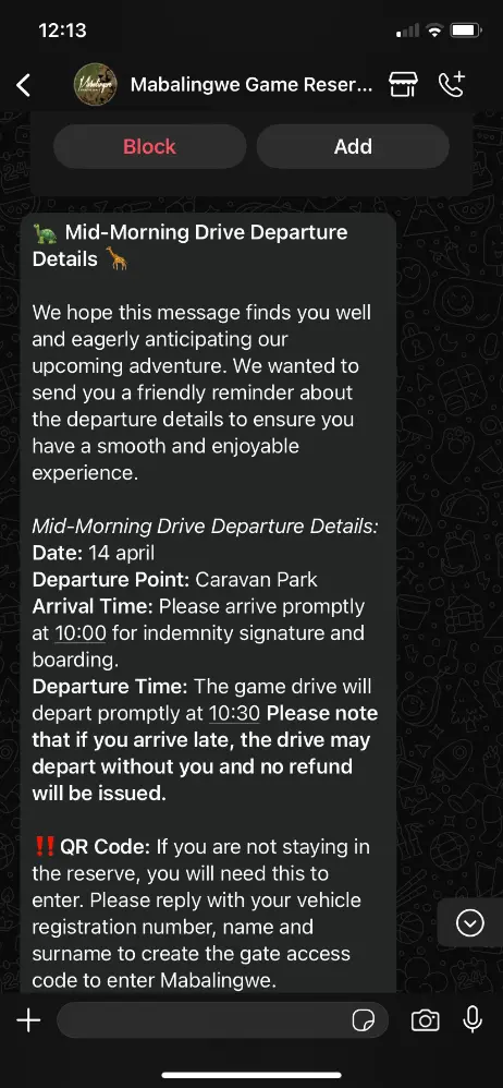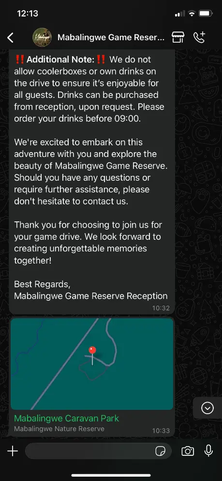 No joke. I was two hours north of any cities, deep in the bush, and WhatsApp made the entire experience so smooth. Not email. Not an app. Not a printed confirmation. WhatsApp. And it worked beautifully.