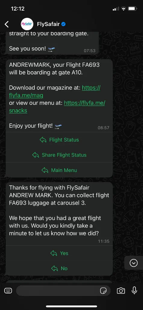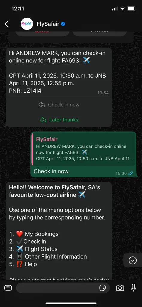 My internal flight check-in also came through WhatsApp:
