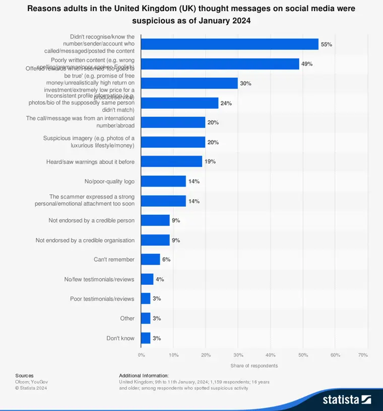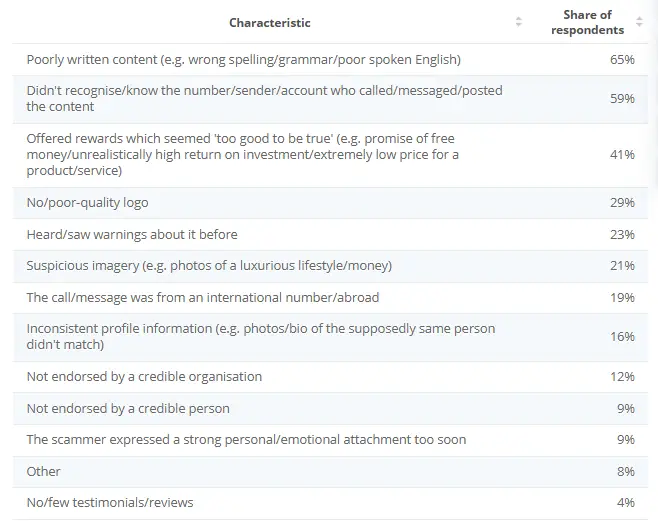 Unfortunately, scams still exist in both email and WhatsApp. What’s striking is that for both channels the “tells” that customers reported are very similar. An unknown sender, poorly written content, and “too good to be true” offers were the top 3 sources of suspicion in both cases.