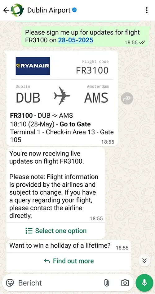 This WhatsApp from Dublin Airport includes the flight code, and the departure and destination airport short codes, just like you would see on your ticket. Along with the Ryanair logo in the message and the airport’s own logo attached to the sender, the message is clear, professional and attractive.