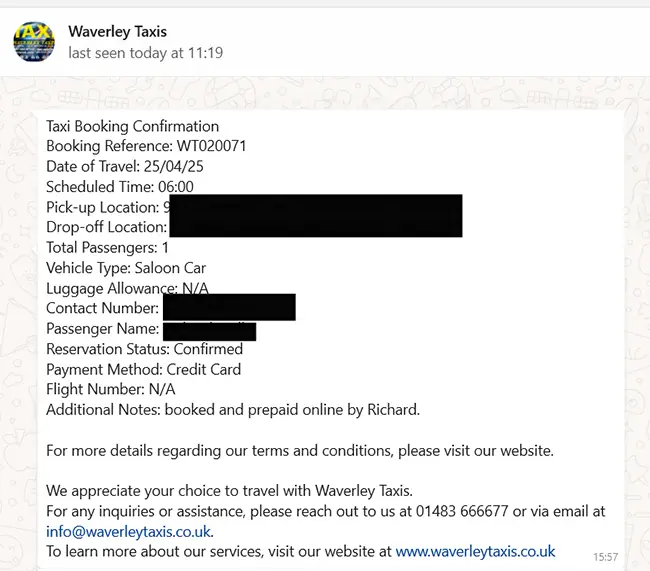 Example of a booking confirmation through WhatsApp: