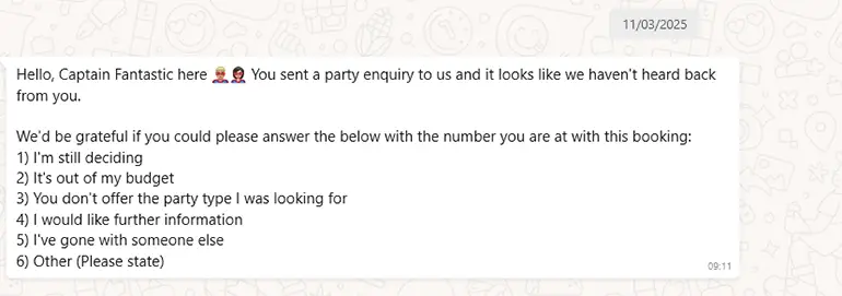 Scrolling through my own WhatsApp, 3 common use cases overlap with email; lead follow-up, resource delivery, and booking confirmations.