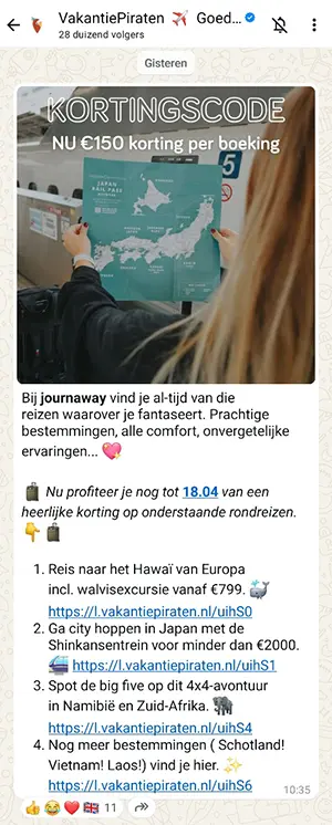 WhatsApp Channels is een relatief nieuwe functie waarmee bedrijven éénrichtingscommunicatie kunnen versturen naar een groot aantal mensen tegelijk. Je kunt updates sturen, zoals nieuws, productlanceringen of aanbiedingen. Dit maakt het een perfecte manier om publieke communicatie te verzorgen zonder de interactie van een gewoon WhatsApp-gesprek.