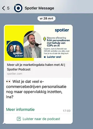 Je kunt WhatsApp ook effectief inzetten voor het geven van updates over nieuwe content, zoals podcasts of blogs. Zo zetten wij WhatsApp in om onze luisteraars op de hoogte te houden van nieuwe afleveringen van de Spotler Podcast.