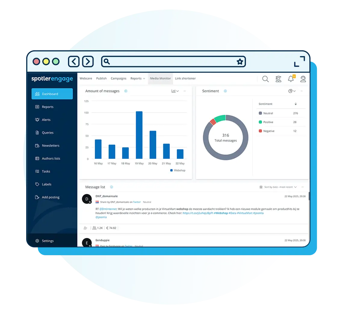 Plan en publiceer eenvoudig content op X met Spotler Engage. En beantwoord mentions en DM’s gemakkelijk via onze software. Dat kan overzichtelijk en razendsnel vanuit één dashboard.