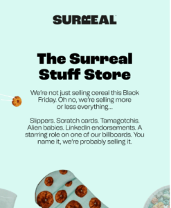 This example from DTC cereal brand Surreal stays true to their colour palette, which should make it far more memorable among an inbox full of black emails.