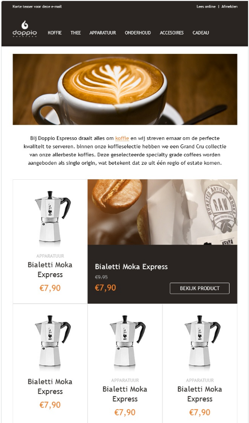 Door de beperkte breedte kun je het beste -zoals in het voorbeeld van Doppio- met een 1-koloms opmaak werken. Je wilt voorkomen dat je lezers continu het beeldscherm groter en kleiner moeten maken. Daar haken veel lezers op af en dat gaat ten koste van de effectiviteit van je mailing.