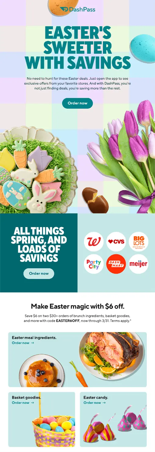 Leading with Easter candy makes sense, but we like the way DoorDash have incorporated Easter meal staples in a lower block.