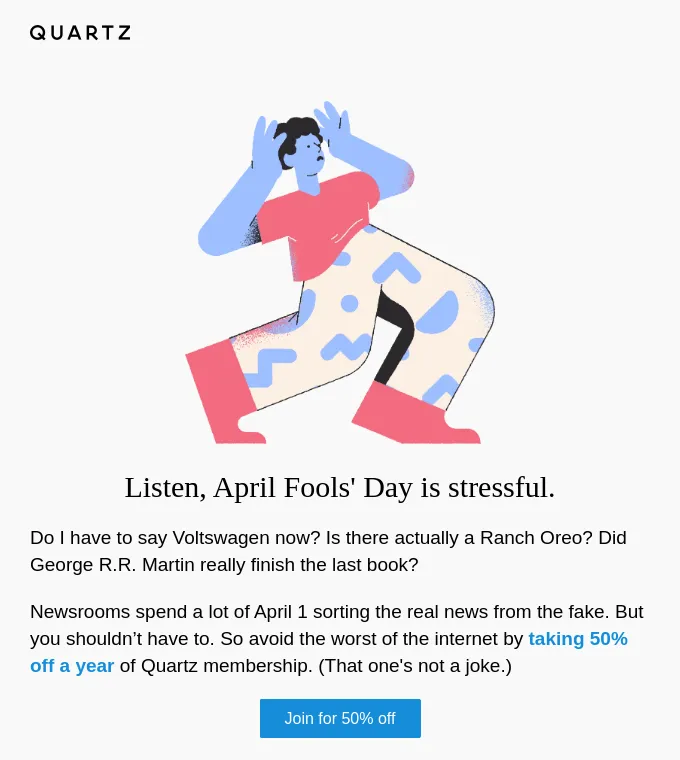 News site Quartz latch onto the idea that having to filter out fake stories from true ones can be stressful for readers, so they promote the fact that they don’t get involved in April Fools at all.