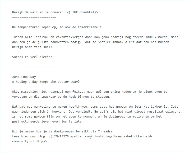 In Spotler is een van de stappen in de opmaak en afronding van je mailings het verzorgen van een tekstversie. ESP’s doen dit niet voor die laatste Nokia-lezers, maar veel meer om te voorkomen dat je mail wordt tegengehouden door spamfilters. Veel spamfilters blokkeren mailings zonder een tekstversie. De reden hiervoor is eenvoudig: spammers nemen vaak niet de moeite om een tekstversie op te maken.