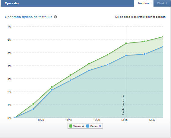 De marketeer testte op open ratio, maar de klikratio gaf na twee uur testtijd een veel duidelijker beeld. De klikratio van de A-variant bedroeg namelijk 9,0% en de B-variant kwam uit op 11,2%.