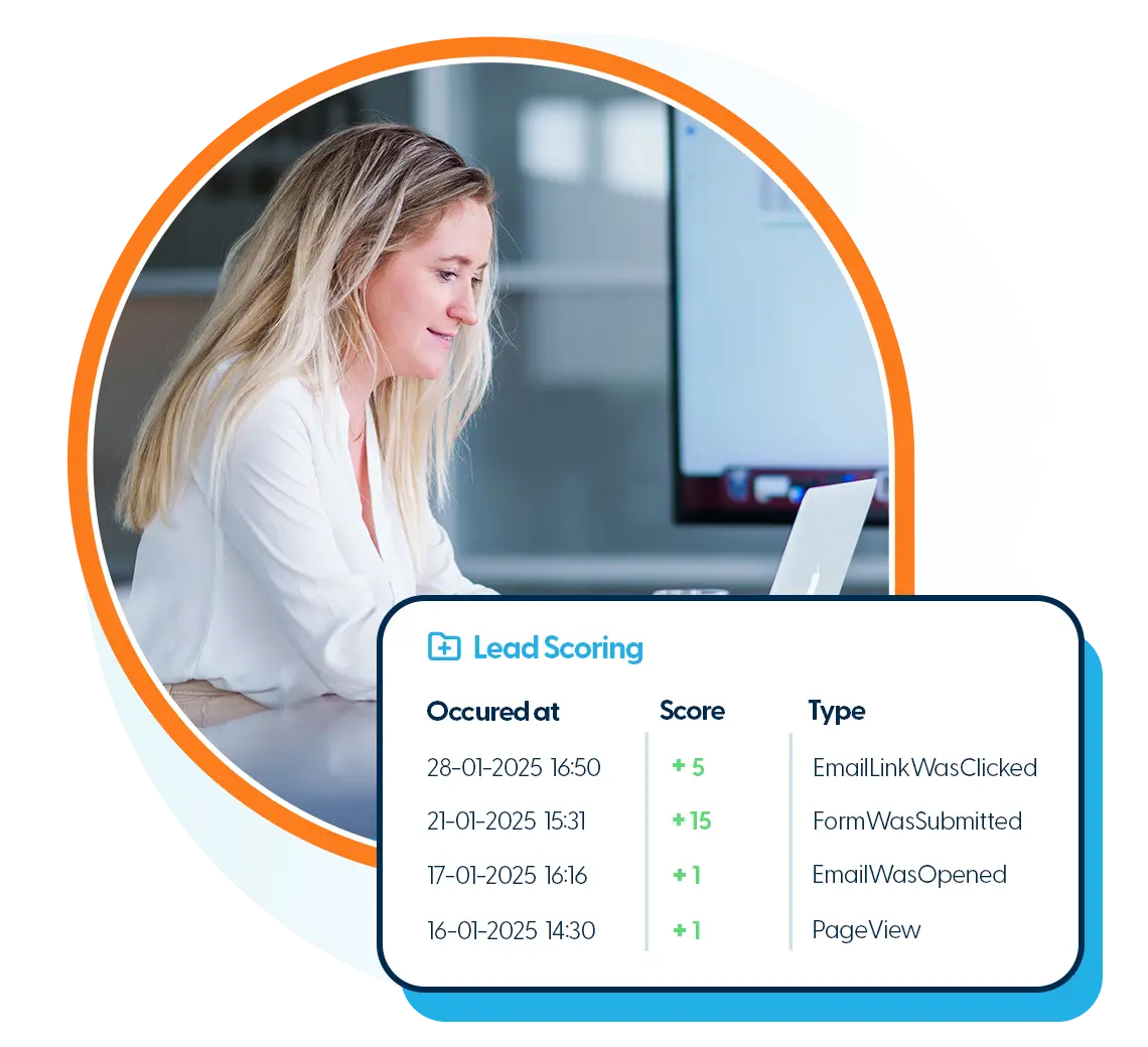 Needless to say, you also determine a score for the different conversions you offer. E.g. a newsletter subscription +5, a whitepaper download +10 and a demo request +25. Once again, you not only score online behaviour but also look at explicit data such as the job title, email address and/or telephone number. Please make this transparent in a shared file (Excel or Google Sheets) so you can always retrieve and adjust it. Combining online behaviour and demographic characteristics will ensure you draw up an optimal scoring model. And this, in turn, ensures that your sales team is presented with the most ideal leads.
