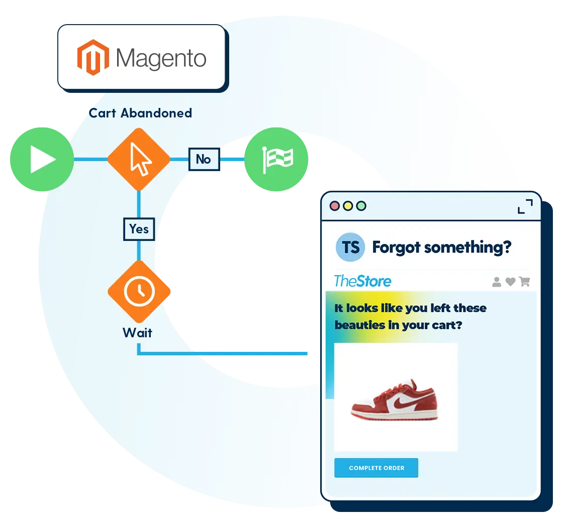Magento events such as cart abandonment, new registrations and completed orders can trigger automated email journeys in Spotler Activate. These journeys help you recover lost revenue and keep customers engaged.