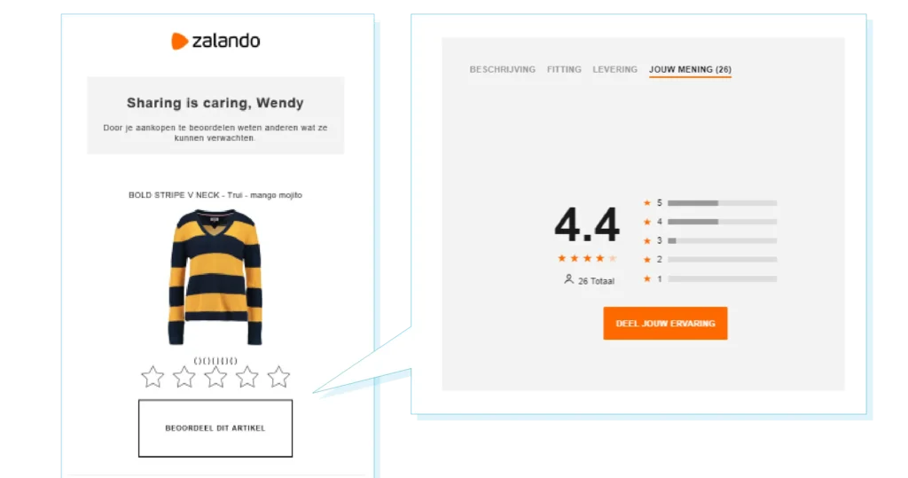 Als je iets bestelt bij bijvoorbeeld Zalando, kan het een tijdje duren voor je wilt vragen om een review. Een klant kan de artikelen nog terugsturen of een deel van de bestelling toch behouden. Je zou hiervoor intern kunnen kijken wat de gemiddelde bedenktijd is of goed registreren wanneer een bestelling is geretourneerd. Als dit bekend is, kun je met de e-mail marketingactiviteiten er rekening mee houden wanneer een reviewcampagne moet worden opgestart.