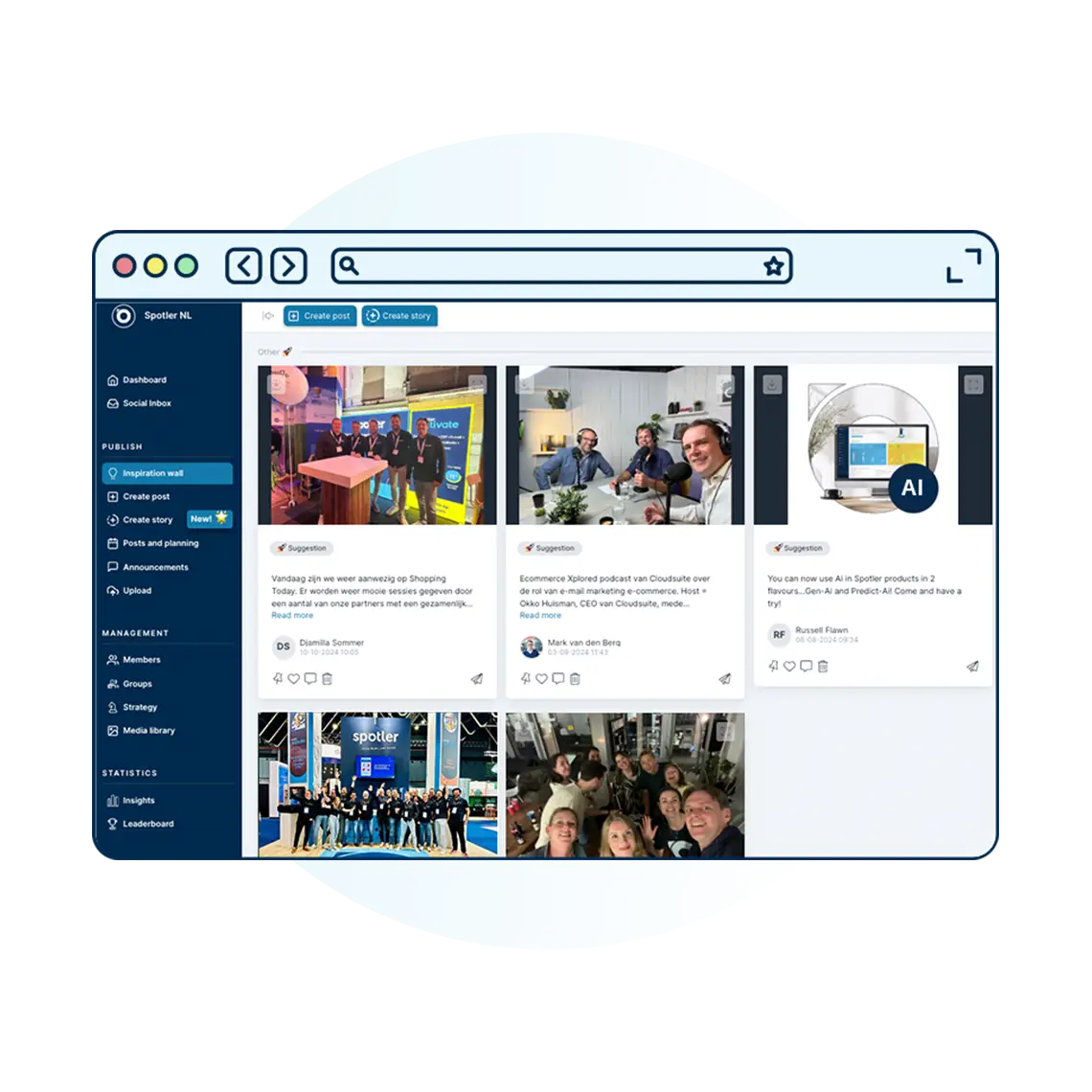 If you want your posts to reach your target audience, Spotler’s social media solution has you covered. From a single dashboard, you can create, assign, publish, and monitor content across various platforms—managing both your business pages and your brand advocates. And when your audience reaches out through direct messages, easily switch to the social inbox to engage in 1-1 conversations.