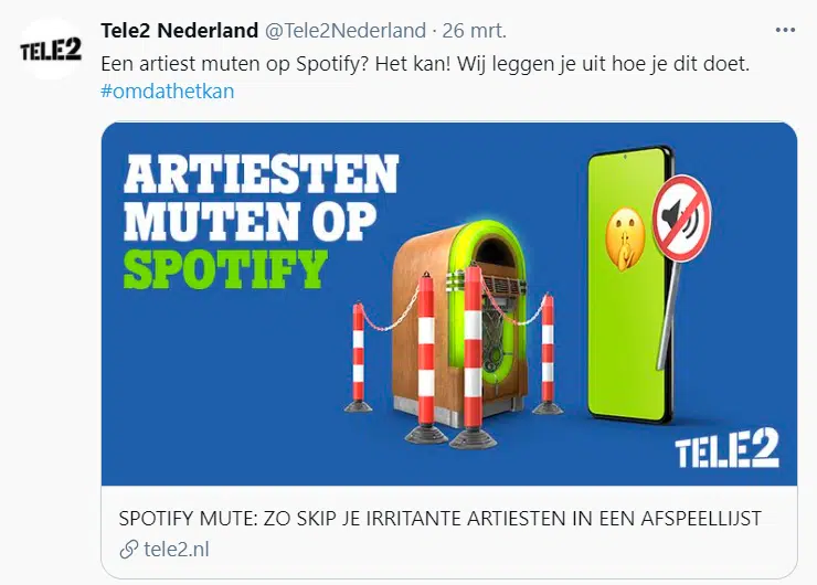 In het voorbeeld hieronder spoort Tele2 hun volgers aan om hun blog over het muten van artiesten op Spotify te lezen. Ze gebruiken hun slogan als hashtag en de opgemaakte afbeelding sluit perfect aan bij de merkidentiteit van het bedrijf.