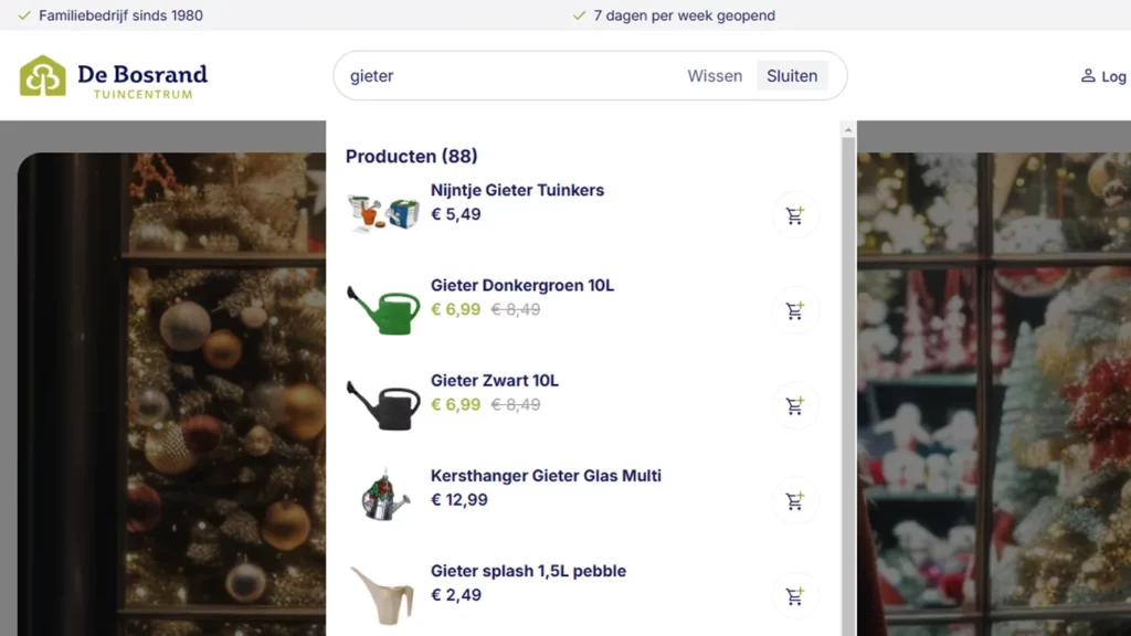Om nog een voorbeeld te geven van hoe organisaties hun best doen om zoekresultaten zo relevant mogelijk weer te geven: kijk eens naar het voorbeeld van Tuincentrum de Bosrand met het zoekresultaat op de query of invoer ‘gieter’. Let vooral op de mooi vormgegeven verhouding tussen productafbeelding, naam, en prijs/korting:
