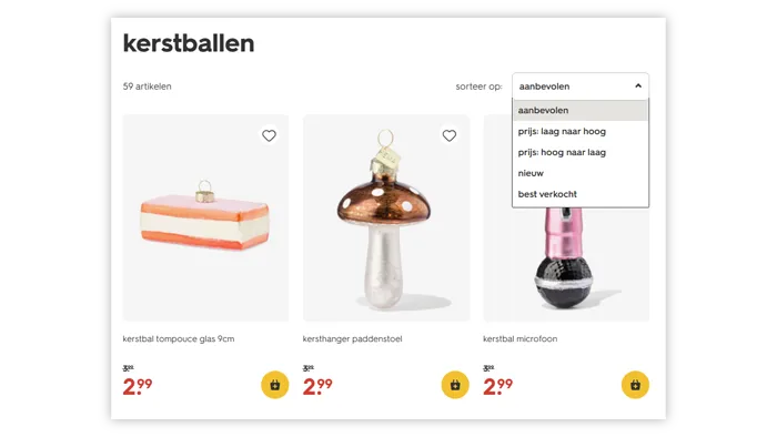 Je kunt je zoekopdracht – ik zoek kerstballen – filteren op verschillende categorieën. Bij de Hema kun je ‘er komen’ door te klikken op de categorie ’kerst’ vervolgens op de categorie ‘kerstversiering’ en dan verder op ‘kerstboomversiering’. Die laatste categorie zie je ook al in de tweede laag van zoekcategorieën. Het plaatsen en sorteren van categorieën is een wetenschap op zich. Je kunt A/B-testen en eye-trackingonderzoeken uitvoeren om te kijken welke categorieën op welke plek op je site het beste scoren.