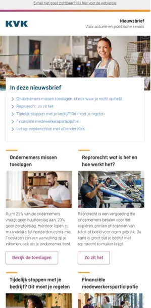 Vooral voor het meten van conversie is een professioneel e-mailbericht handig. Zo werft de Kamer van Koophandel via zijn nieuwsbrief inschrijvingen voor een online sessie over de Cyberbeveiligingswet of de online bijeenkomt over het starten van een eigen bedrijf. In een mooi Agenda-contentblok presenteert de KvK deze informatie.